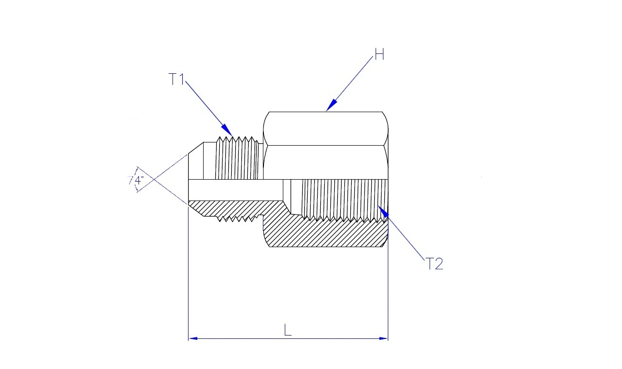 | Part No. | T1 - JIC 37° Male | T2 - BSPT Female | L (Length) | HEX (Width) |