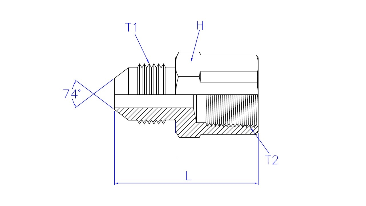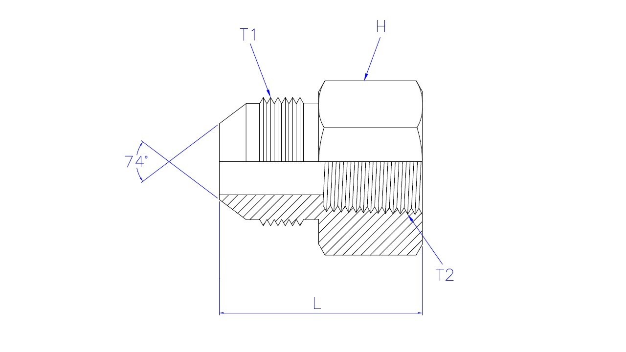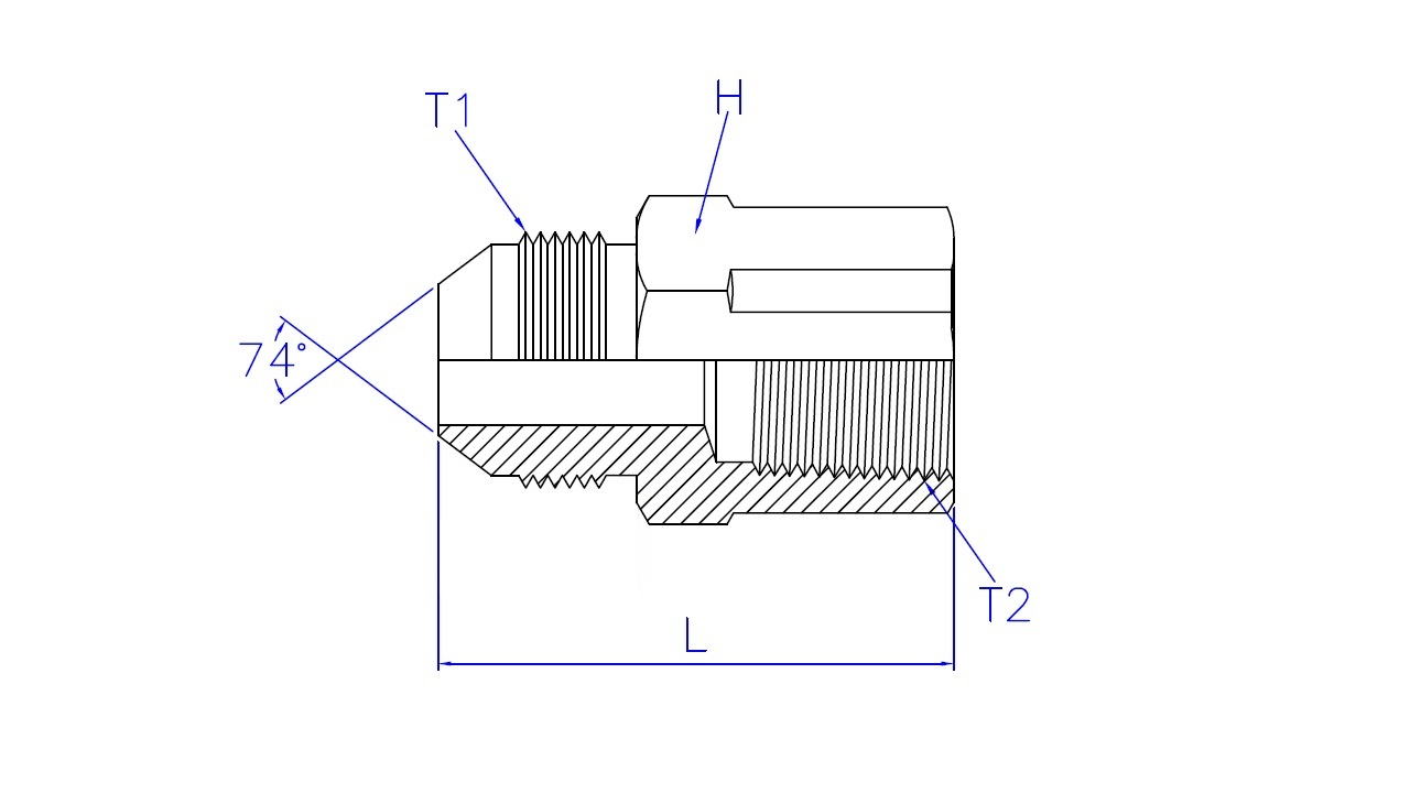 | Part No. | T1 - JIC 37° Male | T2 - NPT Female | L (Length) | HEX (Width) |