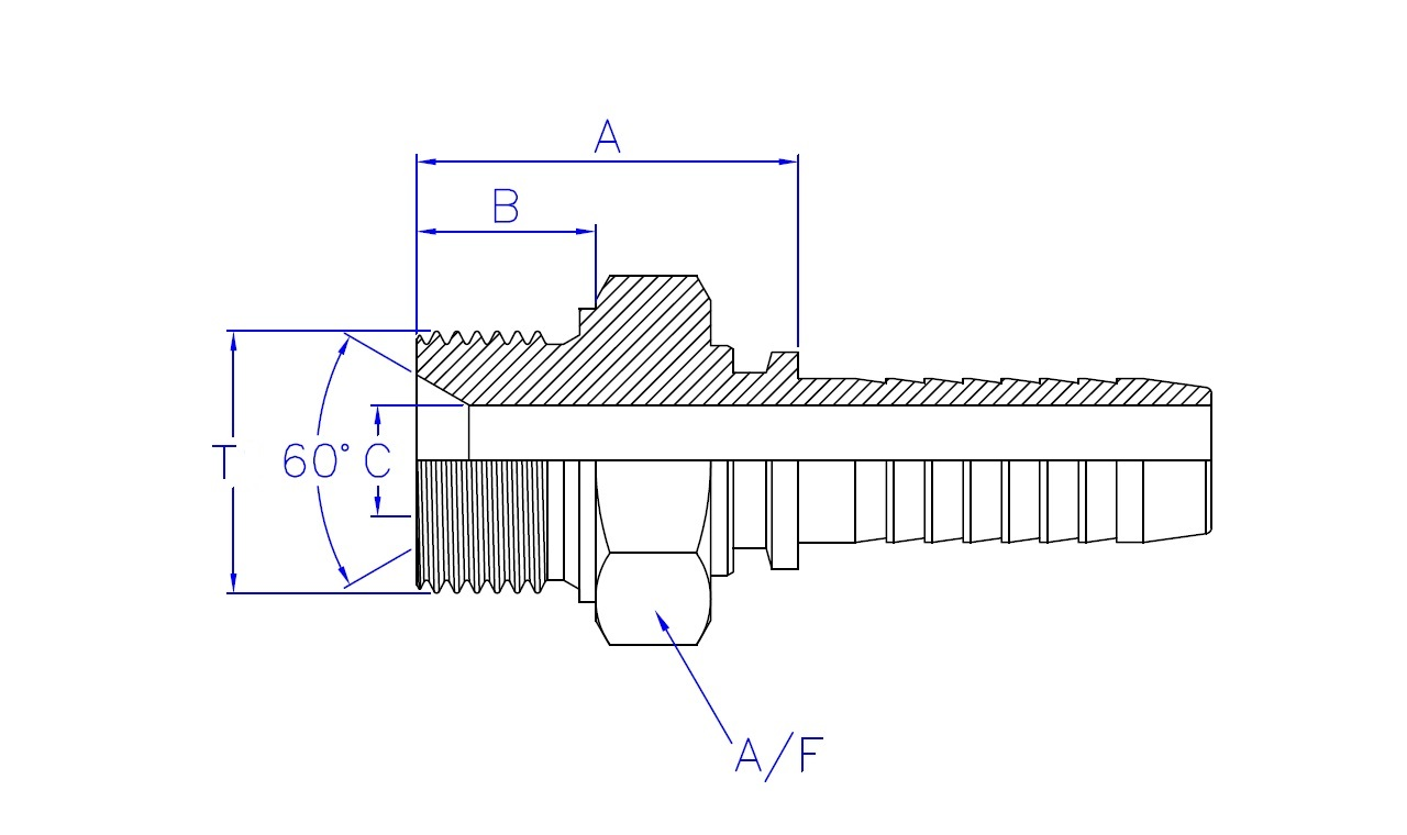 | BSPP Male Thread | Barbed End | Thread Dash Size | Applied Hose Dash Size | Material |