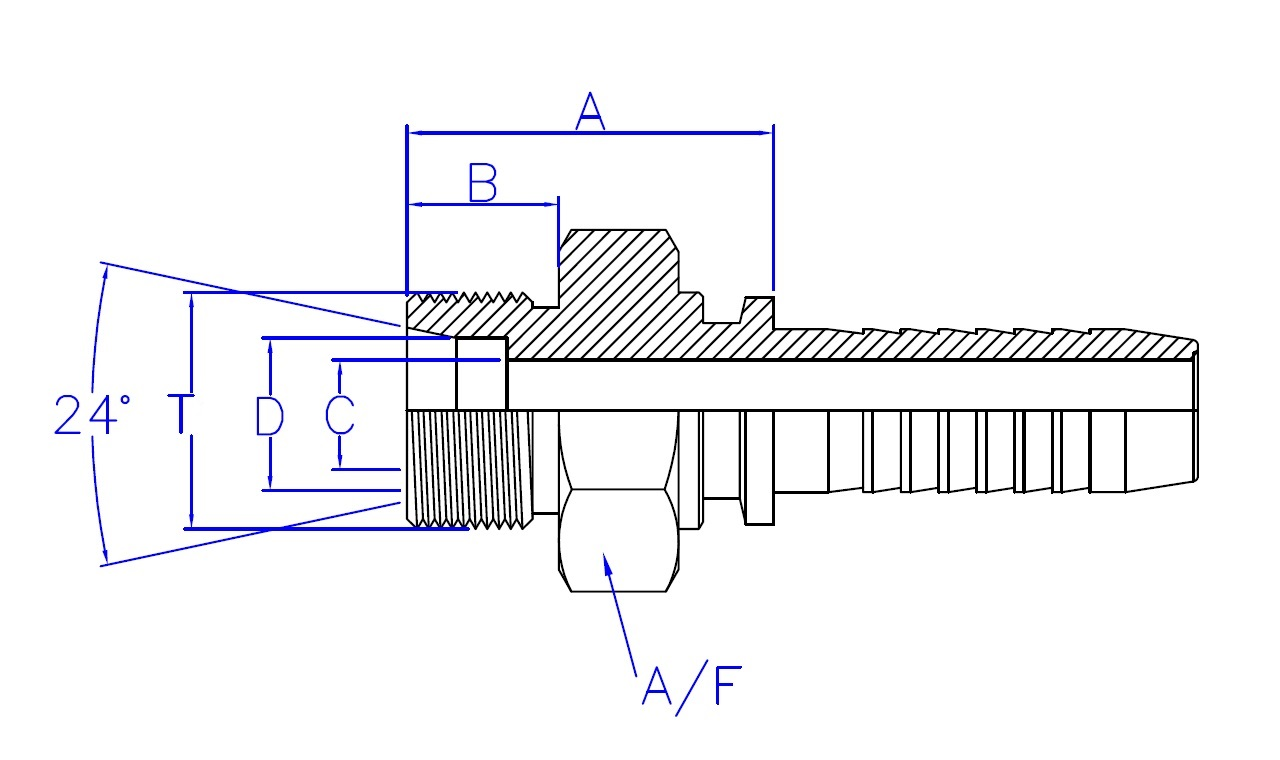 | GAZ 24° | Barbed End | Thread Dash Size | Applied Hose Dash Size | Material |